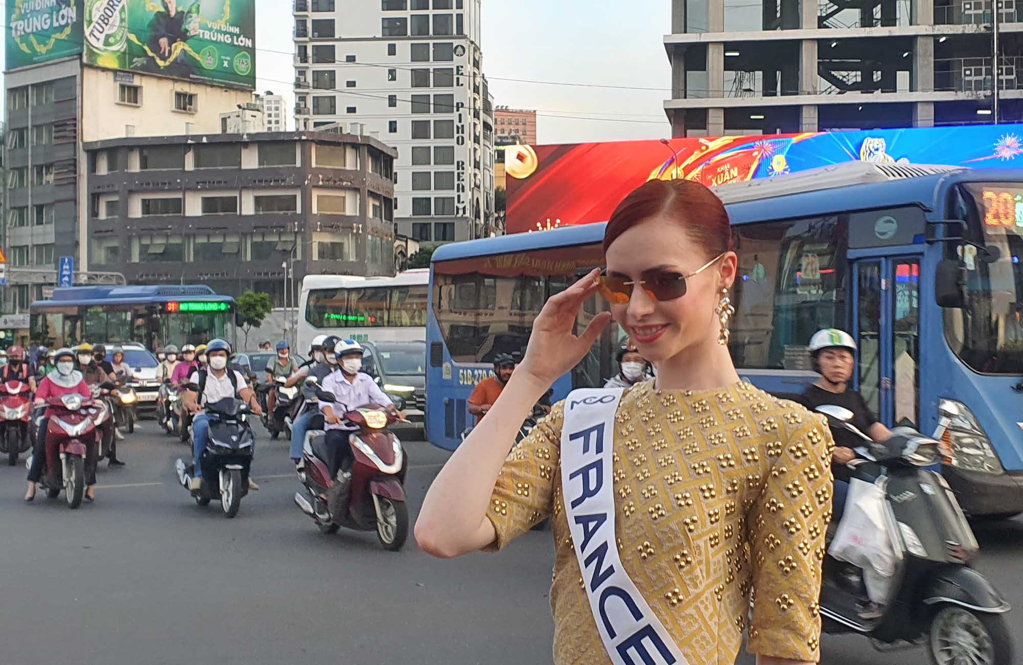 | Dàn người đẹp dạo phố và vẫy chào người dân TP.HCM. |