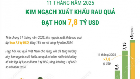 Xuất khẩu rau quả đạt hơn 7,8 tỷ USD sau 11 tháng năm 2025Tính chung 11 tháng năm 2025, kim ngạch xuất khẩu rau quả đạt hơn 7,8 tỷ USD, tăng 18% so với cùng kỳ năm 2024. Hiệp hội Rau quả Việt Nam cho rằng, với đà tăng trưởng này, kim ngạch xuất khẩu rau quả cả năm nhiều khả năng sẽ xác lập kỷ lục mới hơn 8 tỷ USD, tăng khoảng 1 tỷ USD so với năm 2024. -
