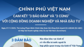 Chính phủ Việt Nam cam kết "3 bảo đảm" và "3 cùng" với cộng đồng doanh nghiệp và nhà đầu tưTại cuộc gặp đoàn Hội đồng Kinh doanh EU - ASEAN (EU - ABC ) và Hiệp hội Doanh nghiệp châu Âu tại Việt Nam (EuroCham), Thủ tướng Phạm Minh Chính khẳng định Chính phủ Việt Nam cam kết "3 bảo đảm" và "3 cùng" với cộng đồng doanh nghiệp và nhà đầu tư nói chung, trong đó có doanh nghiệp và nhà đầu tư châu Âu. -