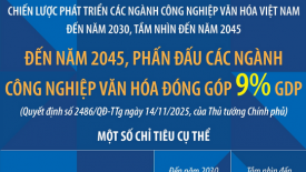 Đến năm 2045, phấn đấu các ngành công nghiệp văn hóa đóng góp 9% GDPChiến lược phát triển các ngành công nghiệp văn hóa Việt Nam đến năm 2030, tầm nhìn đến năm 2045 đặt mục tiêu chung là: Phát triển các ngành công nghiệp văn hóa trở thành các ngành kinh tế quan trọng, phấn đấu tăng trưởng ở mức cao và gia tăng kim ngạch xuất khẩu những sản phẩm công nghiệp văn hóa thuộc các lĩnh vực trọng tâm, trọng điểm... -