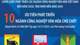 Ưu tiên phát triển 10 ngành công nghiệp văn hóa chủ chốtChiến lược phát triển các ngành công nghiệp văn hóa Việt Nam đến năm 2030, tầm nhìn đến năm 2045 xác định 10 ngành công nghiệp văn hóa chủ chốt được ưu tiên phát triển gồm: Điện ảnh; Mỹ thuật, nhiếp ảnh và triển lãm; Nghệ thuật biểu diễn; Phần mềm và các trò chơi giải trí; Quảng cáo; Thủ công mỹ nghệ; Du lịch văn hóa; Thiết kế sáng tạo; Truyền hình và phát thanh; Xuất bản. -