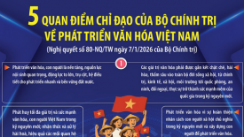 Năm quan điểm chỉ đạo của Bộ Chính trị về phát triển văn hóa Việt NamTại Nghị quyết số 80-NQ/TW của Bộ Chính trị về phát triển văn hóa Việt Nam, Bộ Chính trị khẳng định: Phát triển văn hóa, con người là nền tảng, nguồn lực nội sinh quan trọng, động lực to lớn, trụ cột, hệ điều tiết cho phát triển nhanh và bền vững đất nước... -