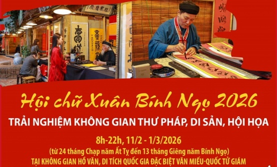 Diễn ra từ ngày 11/2 đến ngày 1/3/2026 (tức từ ngày 24 tháng Chạp năm Ất Tỵ đến ngày 13 tháng Giêng năm Bính Ngọ), Hội chữ Xuân Bính Ngọ 2026 có chủ đề “Quốc học” gắn với kỷ niệm 950 năm ra đời Quốc Tử Giám - trường quốc học đầu tiên của Việt Nam.
