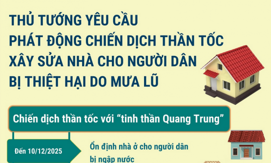 Thủ tướng yêu cầu các địa phương phát động chiến dịch thần tốc với “tinh thần Quang Trung” để xây dựng lại nhà mới và sửa chữa lại nhà hư hỏng cho người dân do mưa lũ gây ra; phấn đấu từ nay đến ngày 10/12/2025 phải ổn định nhà ở cho người dân bị ngập nước, đến ngày 31/12/2025 phải sửa chữa xong nhà bị hư hỏng và đến ngày 31/1/2026 phải thực hiện xong việc xây dựng nhà mới cho người dân.