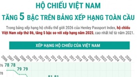 Hộ chiếu Việt Nam tăng 5 bậc trên bảng xếp hạng toàn cầuTrong bảng xếp hạng hộ chiếu thế giới 2026 của Henley Passport Index, hộ chiếu Việt Nam xếp thứ 86, tăng 5 bậc so với xếp hạng năm 2025, cao nhất kể từ năm 2021.