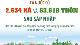 Cả nước có 2.634 xã và 63.619 thôn sau sáp nhậpTheo báo cáo sơ bộ kết quả tổng điều tra nông thôn, nông nghiệp năm 2025, tại thời điểm 1/7/2025, sau khi thực hiện chủ trương sắp xếp đơn vị hành chính và tổ chức chính quyền địa phương hai cấp, cả nước có 2.634 xã, đặc khu (xã) và 63.619 thôn. -