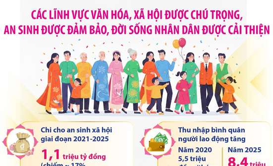 Giai đoạn 2021 - 2025, các lĩnh vực văn hóa, xã hội được chú trọng, an sinh được đảm bảo, đời sống Nhân dân được cải thiện. Chi cho an sinh xã hội giai đoạn 2021 - 2025 ở mức hơn 1,1 triệu tỷ đồng (chiếm khoảng 17% tổng chi NSNN). Thu nhập bình quân người lao động tăng từ 5,5 triệu đồng/tháng năm 2020 lên 8,4 triệu đồng/tháng năm 2025...