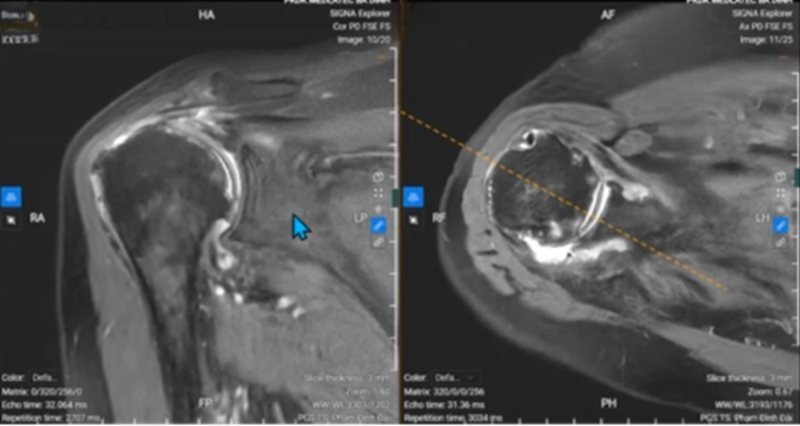 Qua khám lâm sàng, bà H. được chẩn đoán ban đầu là viêm quanh khớp vai, với tình trạng cứng khớp, khó vận động ở hầu hết các động tác, kèm nhiều điểm đau quanh khớp khi ấn. Để đánh giá chính xác mức độ tổn thương, bác sỹ chỉ định chụp cộng hưởng từ (MRI).
