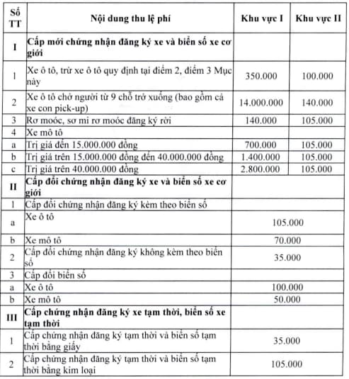 “Mức thu lệ phí cấp chứng nhận đăng ký, biển số phương tiện giao thông được thực hiện như sau: