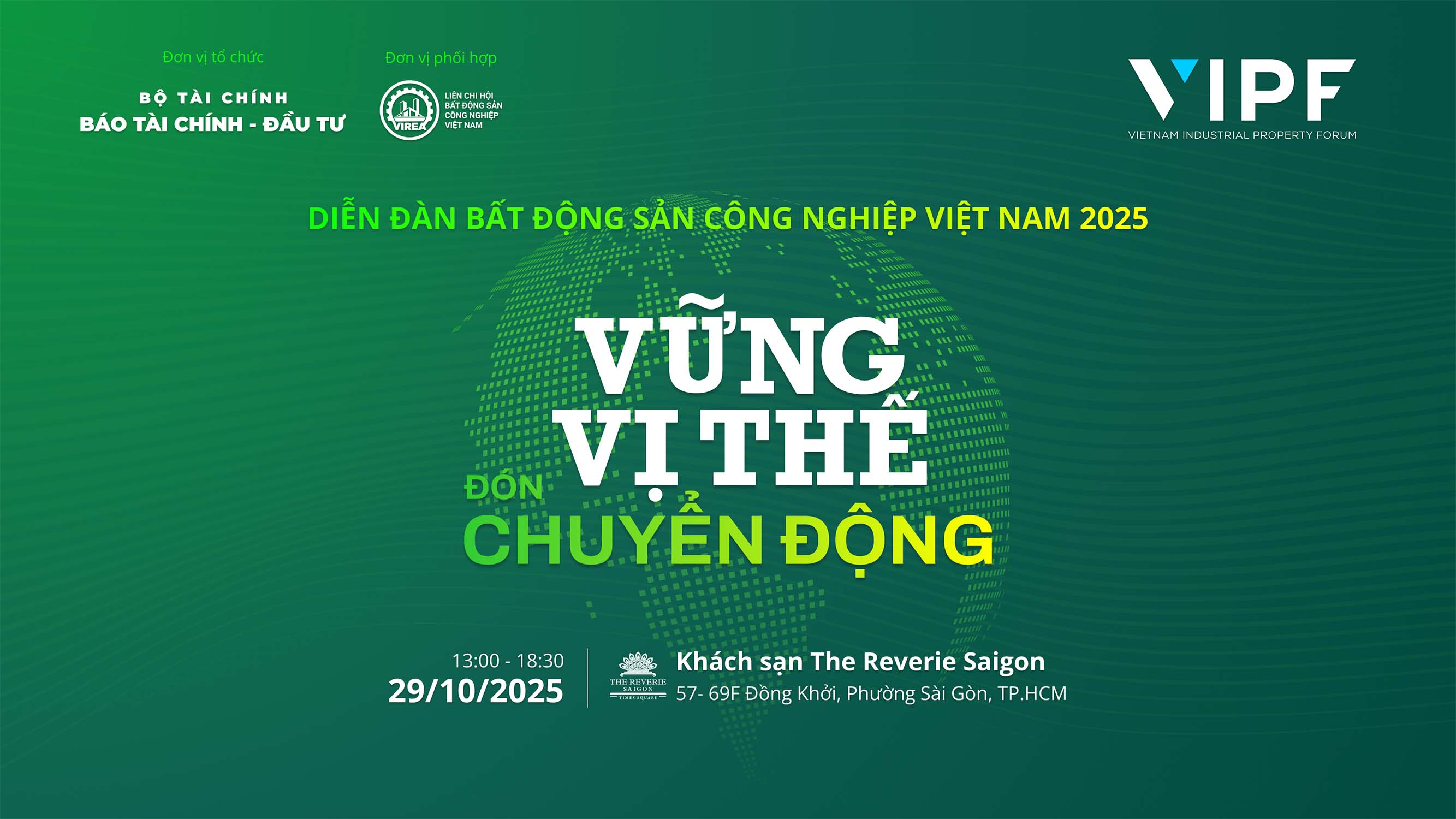 Dưới sự bảo trợ của Bộ Tài chính, Diễn đàn Bất động sản công nghiệp Việt Nam (VIPF) lần thứ 5 năm 2025 do Báo Tài chính - Đầu tư và Liên chi hội Bất động sản công nghiệp Việt Nam (VIREA) phối hợp tổ chức sẽ chính thức khai mạc chiều thứ tư 29/10/2025 tới đây tại Khách sạn The Reverie Saigon (Times Square), TP.HCM