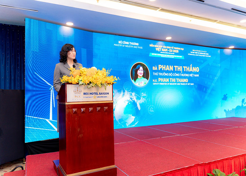 Chủ trì và phát biểu khai mạc sự kiện, Thứ trưởng Bộ Công thương Phan Thị Thắng ghi nhận kết quả tăng trưởng và những chuyển dịch tích cực trong hợp tác kinh tế thương mại Việt Nam - EU sau cột mốc 5 năm Hiệp định EVFTA, bất chấp biến động thị trường, hoạt động giao thương và kinh tế toàn cầu đối mặt với nhiều khó khăn.