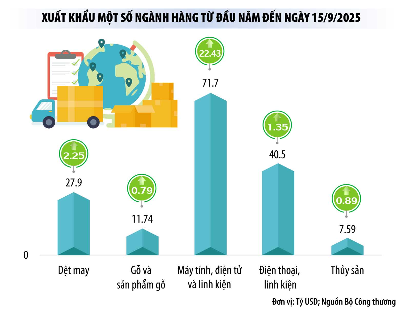 Dù chưa có thống kê đầy đủ về xuất khẩu 9 tháng, nhưng số liệu sơ bộ nửa đầu tháng 9/2025 do Cục Hải quan công bố cho thấy sự sụt giảm đáng kể ở nhiều nhóm hàng chủ lực.