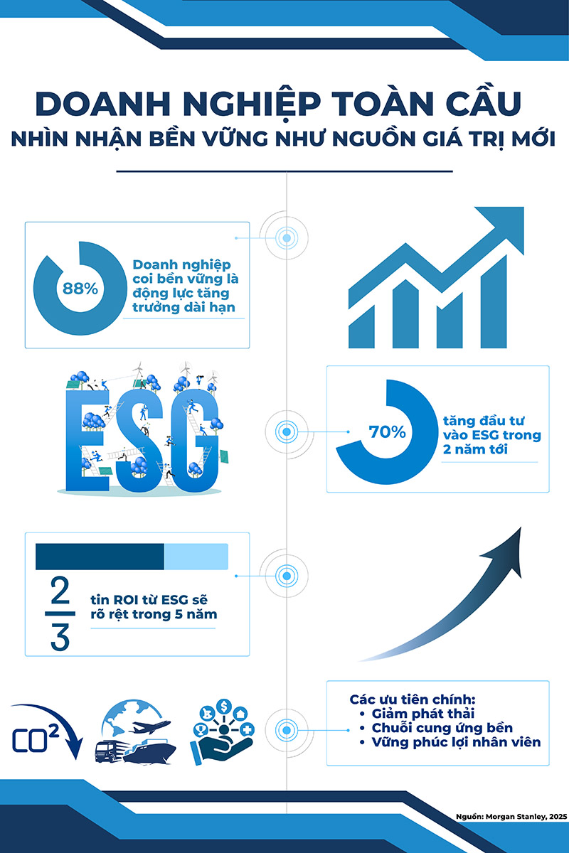 Một báo cáo mới đây của Morgan Stanley - một trong những định chế tài chính lớn nhất thế giới - cho thấy 88% doanh nghiệp toàn cầu coi bền vững là động lực tăng trưởng dài hạn. Con số này phản ánh rõ sự thay đổi trong nhận thức: ESG không còn là khẩu hiệu, mà là chiến lược sống còn để gia tăng giá trị cho cổ đông, người lao động, khách hàng và cộng đồng.
