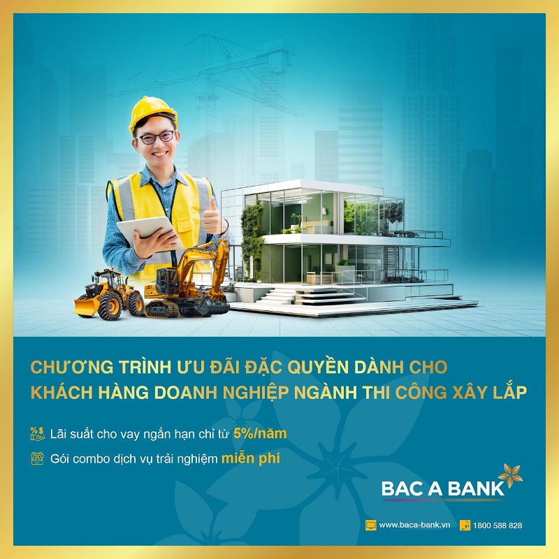 Nắm bắt tình hình của thị trường, BAC A BANK chính thức triển khai Chương trình ưu đãi đặc quyền dành cho khách hàng doanh nghiệp ngành thi công xây lắp, đáp ứng nhu cầu tổng thể, chuyên biệt của doanh nghiệp. Các khách hàng doanh nghiệp là nhà thầu chính, nhà thầu phụ hoặc thành viên nhà thầu liên danh đáp ứng các điều kiện của BAC A BANK đều có thể tham gia sản phẩm này.