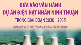Đưa vào vận hành dự án điện hạt nhân Ninh Thuận trong giai đoạn 2030 - 2035Nghị quyết số 70-NQ/TW ngày 20/8/2025 của Bộ Chính trị về bảo đảm an ninh năng lượng quốc gia đến năm 2030, tầm nhìn đến năm 2045 đã nêu những mục tiêu cụ thể. Đối với điện hạt nhân, Nghị quyết yêu cầu khẩn trương triển khai các dự án điện hạt nhân Ninh Thuận 1 và Ninh Thuận 2 với các đối tác phù hợp, bảo đảm lợi ích cao nhất của Việt Nam có tính đến thoả thuận trước đây, đưa vào vận hành trong giai đoạn 2030 - 2035. -