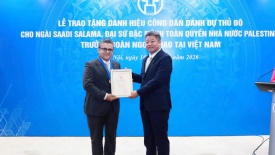 Đại sứ Palestine Saadi Salama được trao danh hiệu Công dân danh dự Thủ đô Hà NộiDanh hiệu Công dân danh dự Thủ đô Hà Nội trao tặng Đại sứ Nhà nước Palestine Saadi Salama là sự ghi nhận trân trọng của Chính quyền và Nhân dân Thủ đô đối với một nhà ngoại giao gắn bó bền bỉ, dành nhiều tâm huyết, trí tuệ và tình cảm cho Hà Nội suốt hơn 4 thập kỷ. -