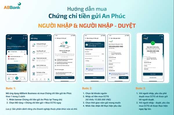 Chứng chỉ tiền gửi (CCTG) An Phúc của ABBank được thiết kế cho các nhu cầu tài chính ngắn hạn, với kỳ hạn tối thiểu từ 3 tháng và mức tham gia chỉ từ 10 triệu đồng. Sản phẩm được triển khai trên nền tảng số, khách hàng cá nhân chỉ cần giao dịch trên ứng dụng ABBank và khách hàng doanh nghiệp thực hiện trên ABBank Business.