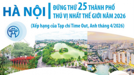 Hà Nội đứng thứ 25 thành phố thú vị nhất thế giới năm 2026Hà Nội - nơi giao thoa giữa nét cổ kính và nhịp sống hiện đại - vừa được Tạp chí Time Out (Anh) xếp hạng thứ 25 trong danh sách 50 thành phố thú vị nhất thế giới để sống và khám phá năm 2026, qua đó tiếp tục khẳng định sức hút ngày càng lớn của Thủ đô Việt Nam trên bản đồ du lịch toàn cầu. -