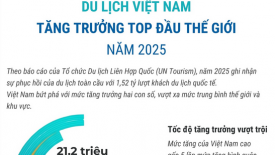 Du lịch Việt Nam tăng trưởng Top đầu thế giới năm 2025Theo báo cáo của Tổ chức Du lịch Liên Hợp Quốc (UN Tourism), năm 2025 ghi nhận sự phục hồi của du lịch toàn cầu với 1,52 tỷ lượt khách du lịch quốc tế. Việt Nam bứt phá với mức tăng trưởng hai con số, vượt xa mức trung bình thế giới và khu vực. -