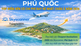 Phú Quốc lọt Top điểm đến có chi phí bay rẻ nhất châu Á năm 2026Phú Quốc xếp thứ 4 trong 10 điểm đến có chi phí bay tốt nhất năm 2026 do nền tảng tìm kiếm và so sánh giá du lịch Skyscanner (Anh) bình chọn, công bố tháng 1/2026. -