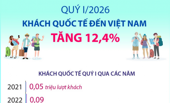 Tính chung quý I/2026, khách quốc tế đến Việt Nam đạt 6,76 triệu lượt người, tăng 12,4% so với cùng kỳ năm trước và là mức cao nhất của quý I các năm từ trước đến nay.