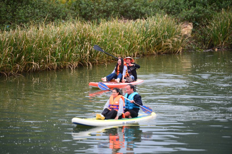 | Ông Doanh và các đại biểu trải nghiệm chèo thuyền sup tại làng Quỳnh Sơn. |