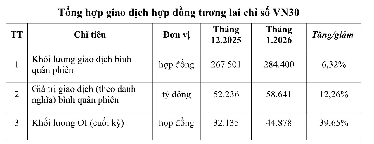 Cùng với sự biến động mạnh trên thị trường chứng khoán cơ sở, thị trường chứng khoán phái sinh giao dịch tăng trong tháng 1. Khối lượng giao dịch bình quân sản phẩm hợp đồng tương lai chỉ số VN30 đạt 284.400 hợp đồng/phiên, tăng 6,32% so với tháng trước. Giá trị giao dịch bình quân đạt 58.641 tỷ đồng/phiên (theo danh nghĩa hợp đồng), tăng 12,26%. Trong đó, phiên giao dịch ngày 15/1/2026 có khối lượng giao dịch lớn nhất tháng với 355.668 hợp đồng.