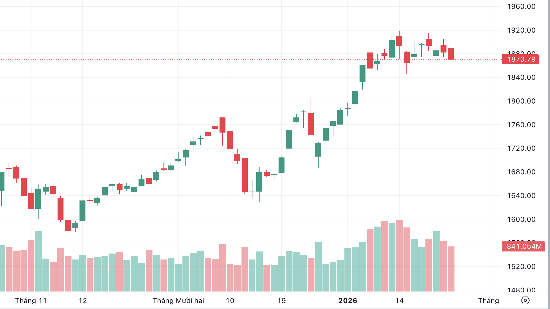Xu hướng ngắn hạn VN-Index duy trì tăng trưởng trên vùng hỗ trợ gần nhất quanh 1.850 điểm, hỗ trợ mạnh hơn 1.800 điểm. VN-Index rủi ro tạo đỉnh ngắn hạn vùng 1.900 điểm -1.920 điểm khi có các phiên liên tiếp chịu áp lực điều chỉnh. VN-Index chịu áp lực kiểm định lại vùng đỉnh giá năm 2025 sau khi vượt qua và có thể chuyển sang giai đoạn tích lũy ngắn hạn sau 5-6 tuần tăng điểm liên tiếp.
