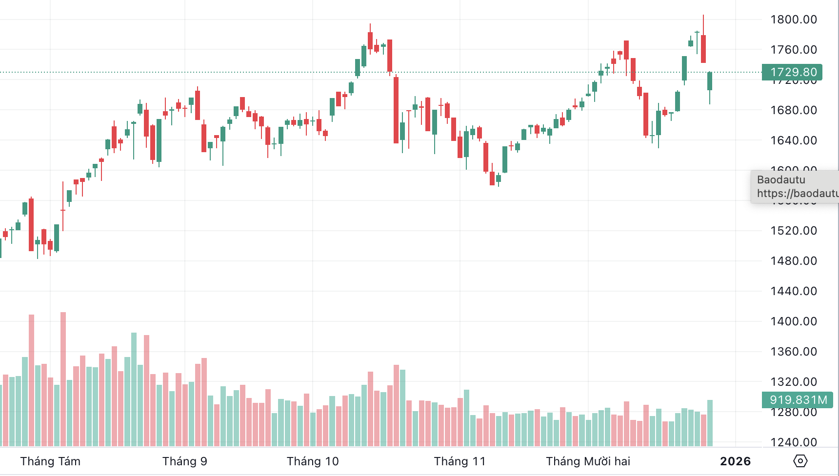 Kết tuần VN-Index vẫn đóng cửa ở mức 1.729,30 điểm, trên mốc tâm lý 1.700 điểm và vẫn tăng 25.49 điểm (+1,5%) so với tuần trước. VN30 kết tuần tăng 1,69% lên mức 1.965,97 điểm, trên hỗ trợ tâm lý 1.900 điểm, chịu áp lực bán mạnh ở vùng đỉnh cũ tháng 10/2025 quanh 2.050 điểm.