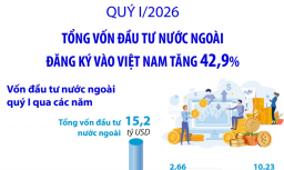 Tổng vốn đầu tư nước ngoài đăng ký vào Việt Nam tăng 42,9% trong quý I/2026 -