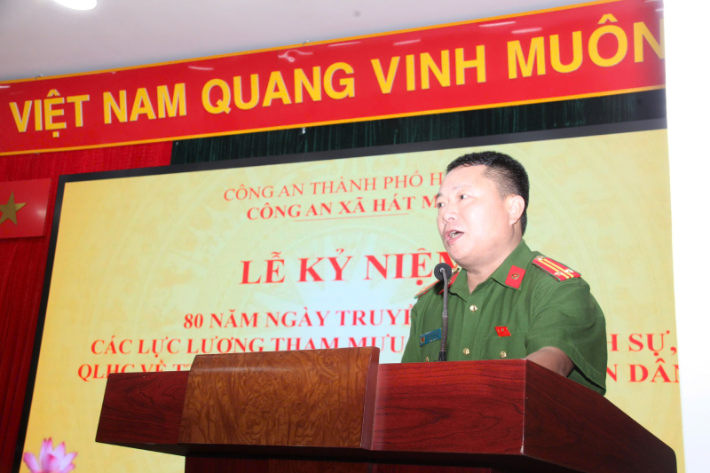 Phát biểu tại Lễ kỷ niệm, Trung tá Đỗ Hồng Quảng - Trưởng Công an xã Hát Môn nhấn mạnh: “Trải qua 80 năm xây dựng, chiến đấu và trưởng thành, dưới sự lãnh đạo tuyệt đối, trực tiếp về mọi mặt của Đảng, sự quản lý tập trung của Nhà nước, các lực lượng đã không ngừng lớn mạnh, lập nên nhiều chiến công xuất sắc”.
