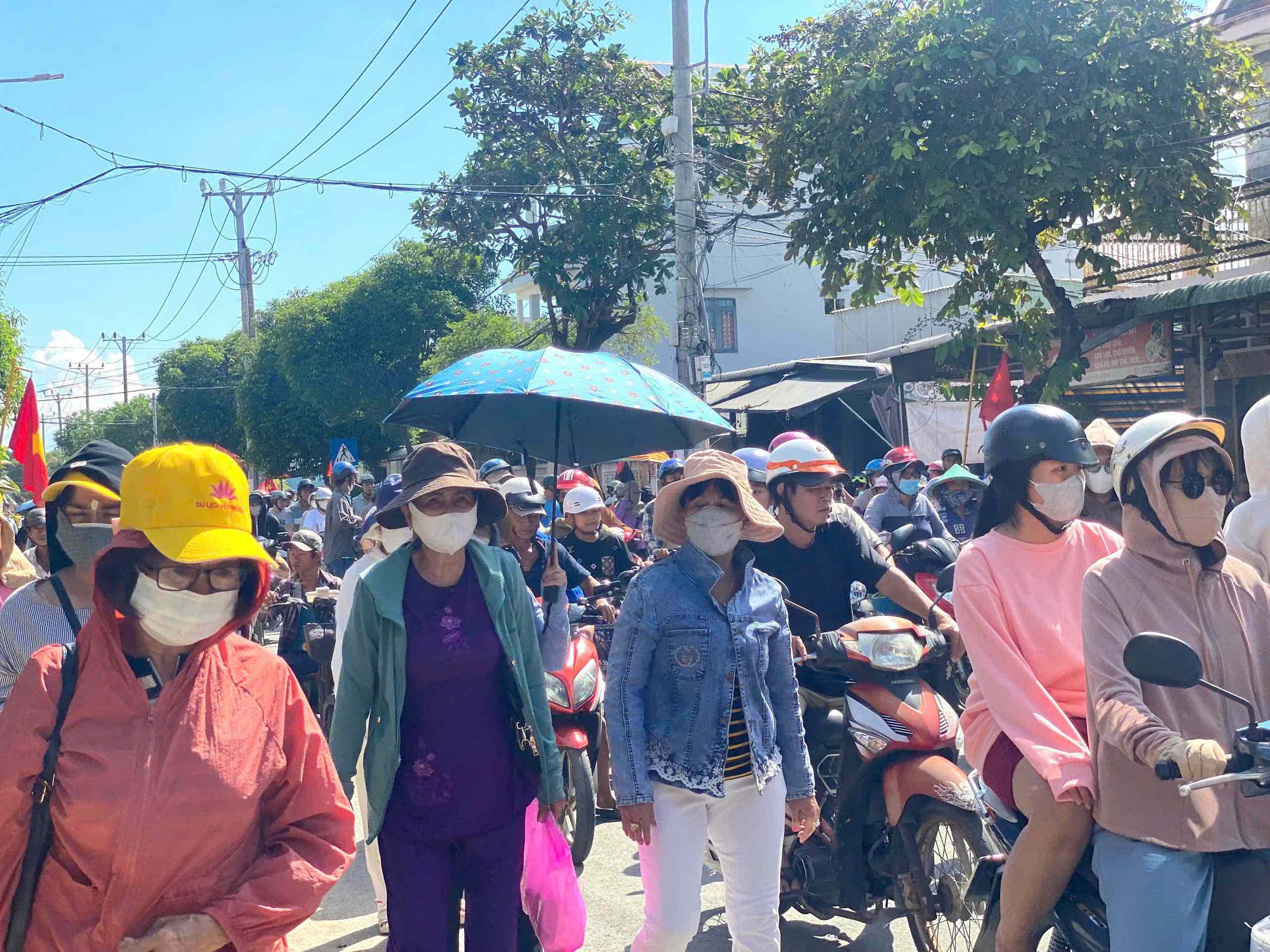 Nhiều người mang nón, khẩu trang, áo khoác và dùng ô che nắng để đi theo đoàn rước đến tận Bến đò Tắc Xuất, Bến đò Cơ khí. |