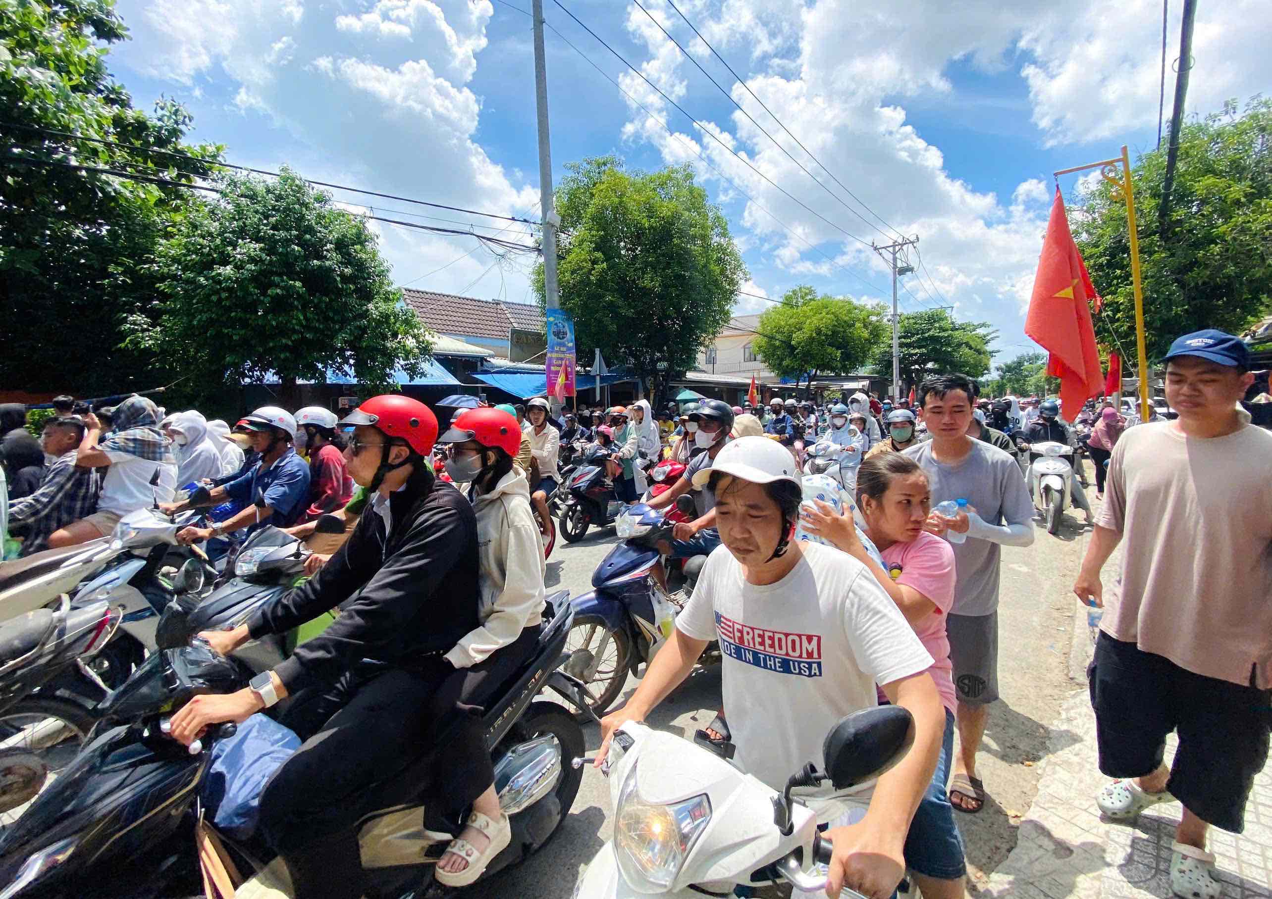 Dưới trời nắng gắt, hàng trăm người dân và du khách vẫn đội nón, che dù đứng kín sân chợ Cần Giờ (TP.HCM) để cổ vũ ngư dân tham gia trò leo...