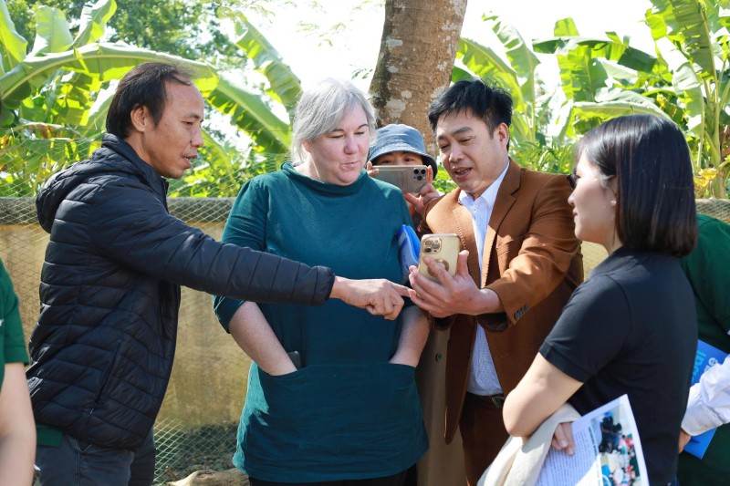 Chiều 25/11, đoàn công tác đến thăm Hợp tác xã Thực phẩm sạch Yên Hòa (HTX) - mô hình do phụ nữ làm chủ và đang trở thành điển hình trong sinh kế xanh tại Quy Đức. Giám đốc HTX Lê Thị Vân cho biết, trước đây các hộ chăn nuôi đơn lẻ gặp nhiều khó khăn và không có thị trường ổn định. Khi thành lập HTX và nhận được hỗ trợ từ chương trình Tiến Về Phía Trước, các hộ có cơ hội cải thiện chuồng trại, tái đàn và tăng sản lượng. Năm 2024, lợn đen đạt hơn một tấn và lợn trắng hơn bảy tấn. Năm 2025, sản lượng tăng vượt bậc khi lợn đen đạt 3,1 tấn và lợn trắng hơn 12 tấn.