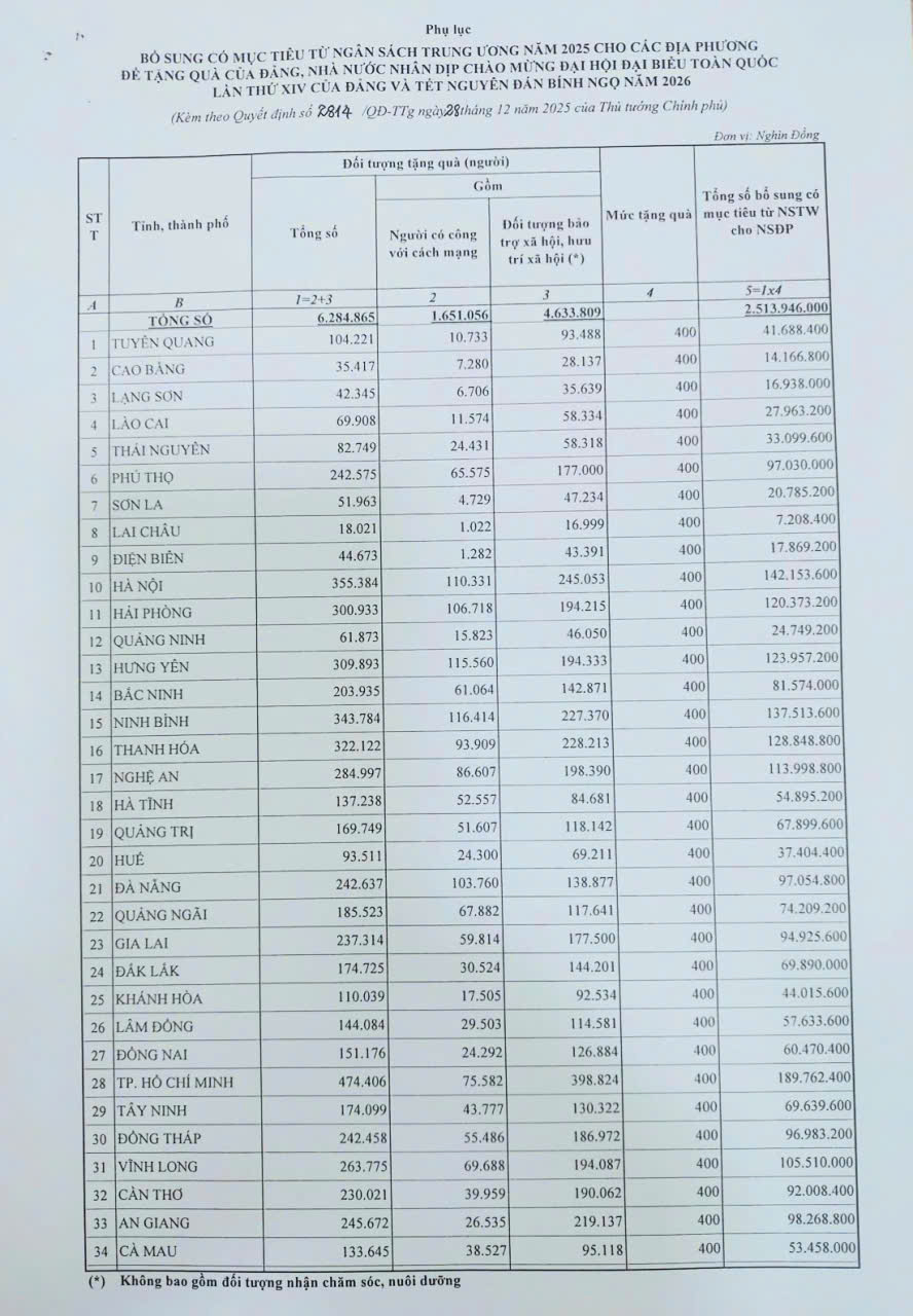 Thủ tướng Chính phủ Phạm Minh Chính vừa ký Quyết định số 2814/QĐ-TTg ngày 28/12/2025 bổ sung có mục tiêu từ ngân sách trung ương năm 2025 cho các địa phương để thực hiện tặng quà của Đảng, Nhà nước nhân dịp chào mừng Đại hội đại biểu toàn quốc lần thứ XIV của Đảng và Tết Nguyên đán Bính Ngọ năm 2026.