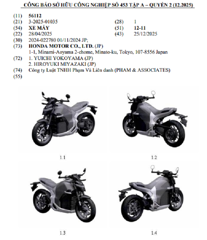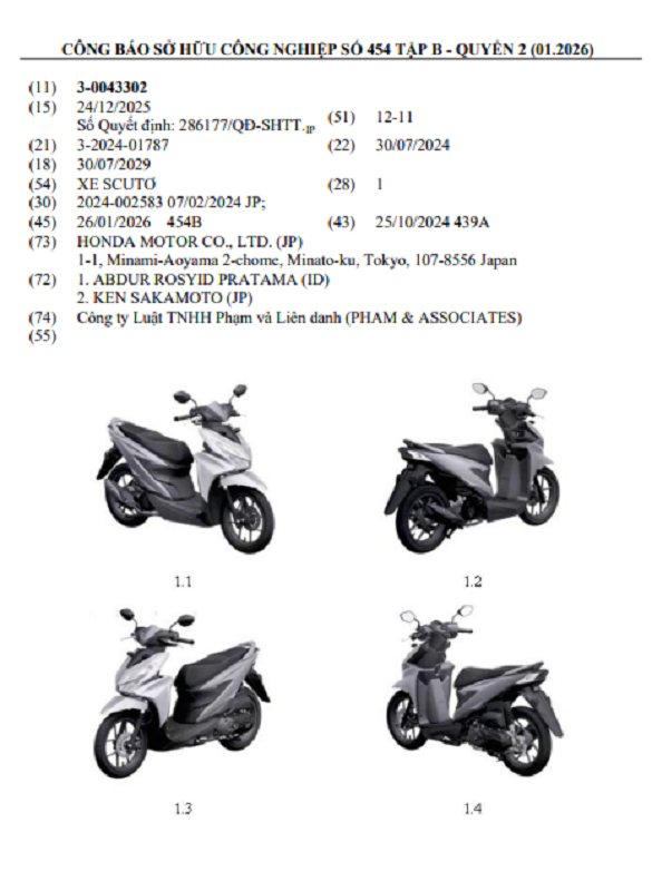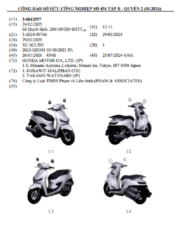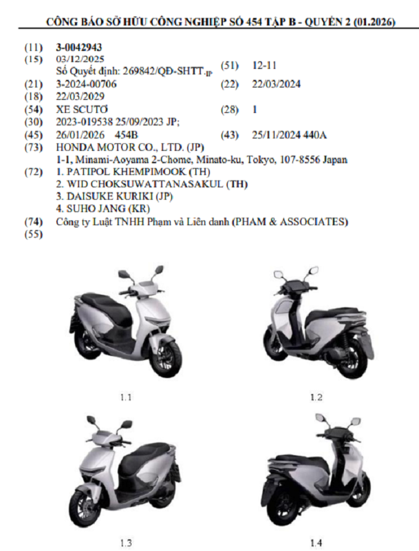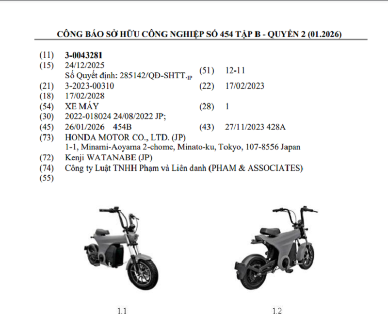 Có 2 mẫu xe máy của Honda mang dáng vẻ xe máy điện đã được chấp nhận bảo hộ đăng ký kiểu dáng công nghiệp tại Việt Nam vào tháng 1/2026 và được công bố trong Công báo Sở hữu công nghiệp tháng 1/2026.