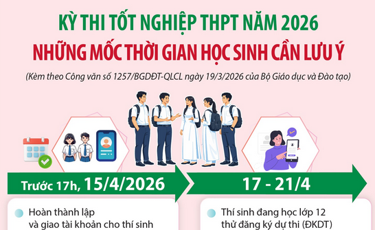 Để chuẩn bị tốt cho Kỳ thi tốt nghiệp THPT năm 2026, thí sinh cần lưu ý những mốc thời gian quan trọng như: Từ ngày 24/4 thí sinh sẽ bắt đầu đăng ký dự thi, sau đó dự thi ngày 11 và 12/6. Kết quả thi được công bố ngày 1/7/2026, kết quả xét tốt nghiệp có chậm nhất ngày 4/7…