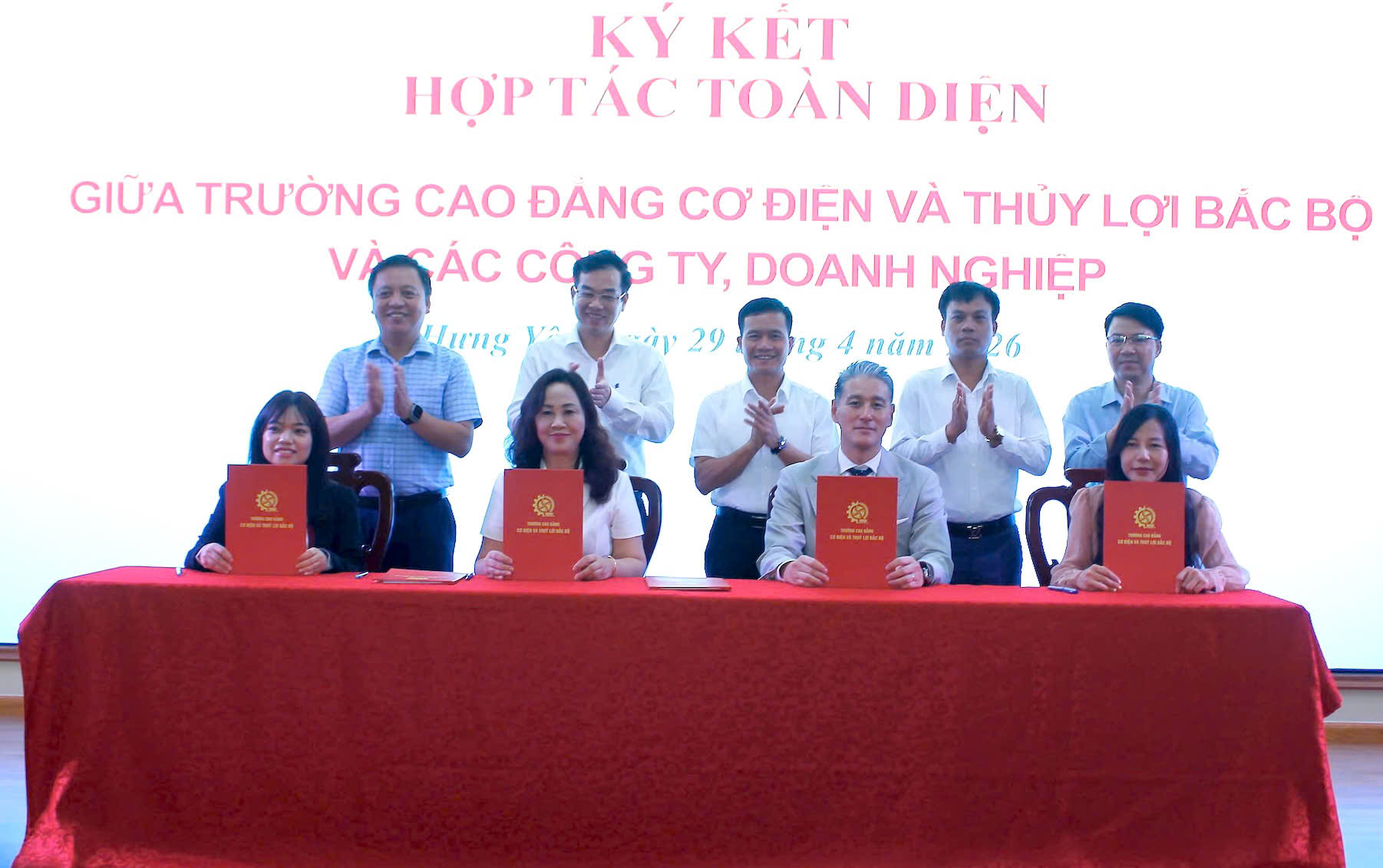 | Trường Cao đẳng Cơ điện và Thủy lợi Bắc bộ ký kết hợp tác với các doanh nghiệp. Ảnh: Đinh Chiến |