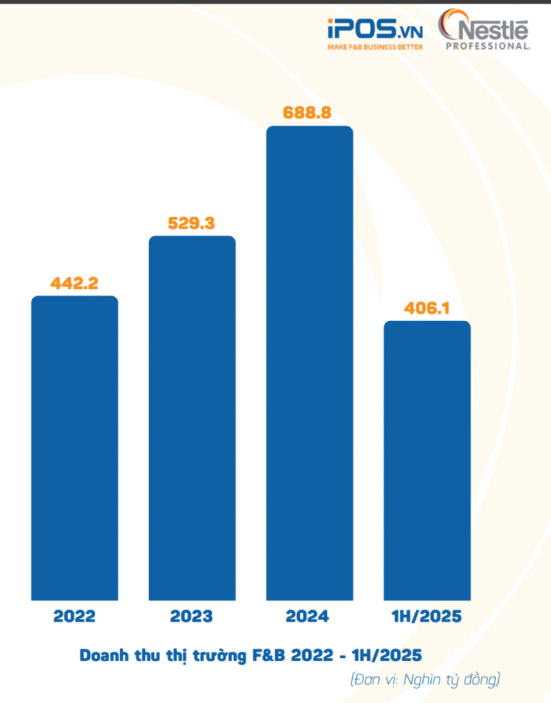 Ông Nguyễn Đỗ Anh Quân - Giám đốc nhãn hàng iPOS.vn đã chia sẻ tổng quan ngành F&B tại Việt Nam 6 tháng đầu năm 2025. Ông cho biết, nửa đầu năm 2025, thị trường ẩm thực, đồ uống (F&B) Việt Nam ghi nhận doanh thu 406.100 tỷ đồng, tương đương 58,9% tổng doanh thu năm 2024 và chỉ nhỉnh hơn nhẹ cùng kỳ (403.900 tỷ đồng). Mức tăng trưởng này được xem là thấp hơn kỳ vọng, khi nhiều chuyên gia từng dự báo năm 2025 có thể đạt mức tăng trên 10%.