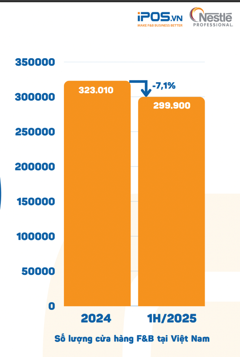 Theo khảo sát của iPOS.vn, tính đến ngày 30/6/2025, cả nước còn khoảng 299.900 cửa hàng F&B, giảm 7,1% so với cuối năm 2024. Đáng chú ý, cả Hà Nội và TP.HCM đều ghi nhận mức giảm trên 11%, cho thấy sự chững lại rõ rệt ở hai đầu tàu của thị trường.