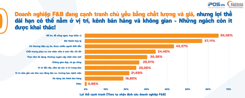Theo ông Quân, 65% doanh nghiệp F&B tin rằng “đồ ăn, đồ uống ngon” là yếu tố cạnh tranh số một, 57% đặt niềm tin vào giá hợp lý. Tuy nhiên, những lợi thế “mềm” như không gian riêng, vị trí chiến lược, kênh bán hàng đa dạng vẫn chưa được nhiều đơn vị khai thác đúng mức.