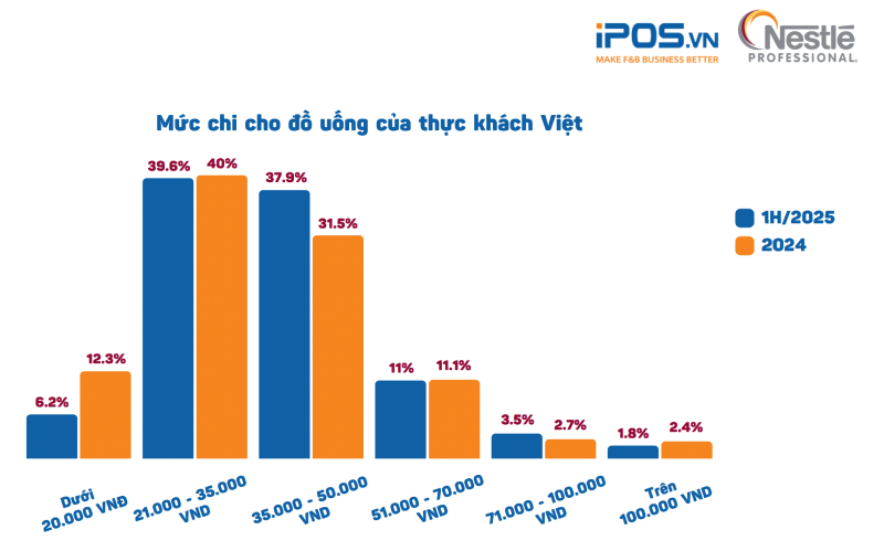 Bữa tối, nhóm chi tiêu trên 100.000 đồng/người tăng mạnh (từ 12,4% lên 19,8%), cho thấy thực khách sẵn sàng chi nhiều hơn cho trải nghiệm, dù tần suất có giảm.