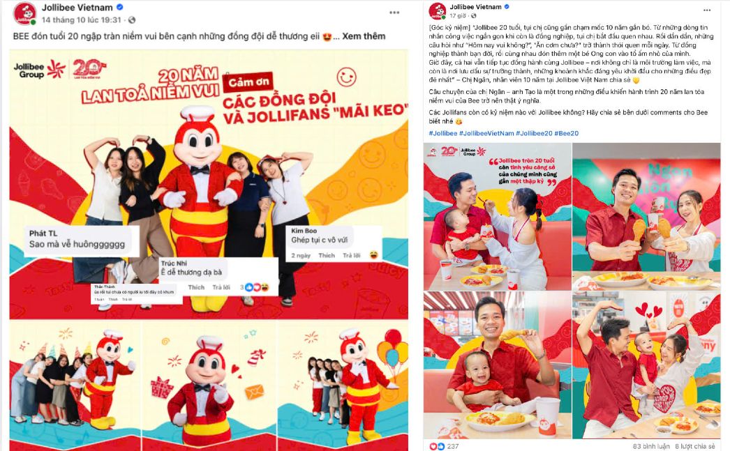 Trong đó phải kể đến, bộ hình “Back in time” được Jollibee Việt Nam chia sẻ trên fanpage chính thức - kể lại hành trình 20 năm của Jollibee Việt Nam thông qua những kỷ niệm của các nhân viên, khách hàng và đối tác. Mỗi một tấm hình là một câu chuyện, là một khoảnh khắc đáng nhớ, truyền tải trọn vẹn tinh thần vui tươi và gắn kết của Jollibee.