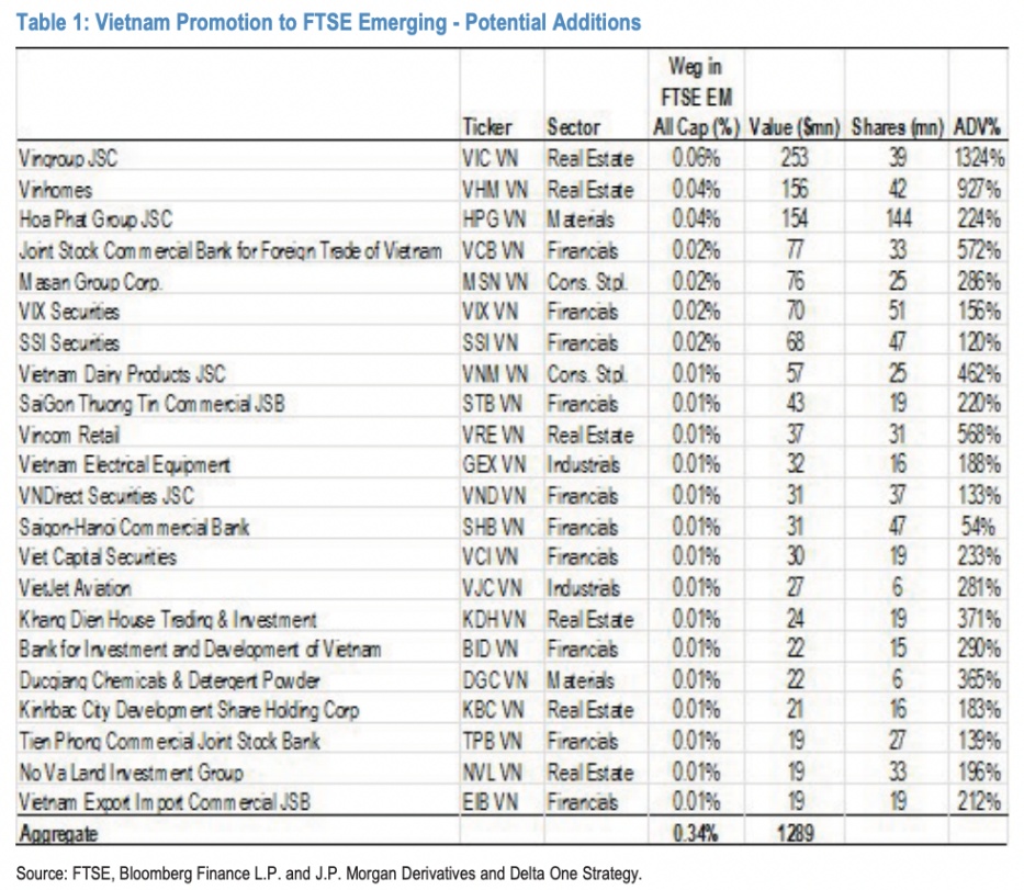 J.P.Morgan cũng đã đưa ra ước tính 22 cổ phiếu Việt Nam có thể được thêm vào các chỉ số FTSE EM, dựa trên giá trị vốn hóa hiện tại. Dòng vốn thụ động ước tính có thể đạt khoảng 1,3 tỷ USD, với tỷ trọng 0,34% trong chỉ số FTSE Emerging Market All Cap.