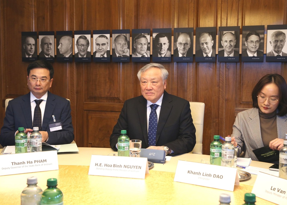 Phó Thủ tướng Thường trực Nguyễn Hòa Bình khẳng định Việt Nam sẽ tiếp tục xây dựng khuôn khổ pháp lý, tạo môi trường thuận lợi, và kêu gọi các doanh nghiệp Thụy Sĩ tăng cường đầu tư và kinh doanh tại Việt Nam, nhất là trong các lĩnh vực tài chính xanh, tài chính số.