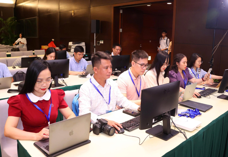 Các nhà báo, phóng viên tác nghiệp tại Trung tâm Báo chí phục vụ Đại hội XVIII Đảng bộ Thành phố Hà Nội. |
