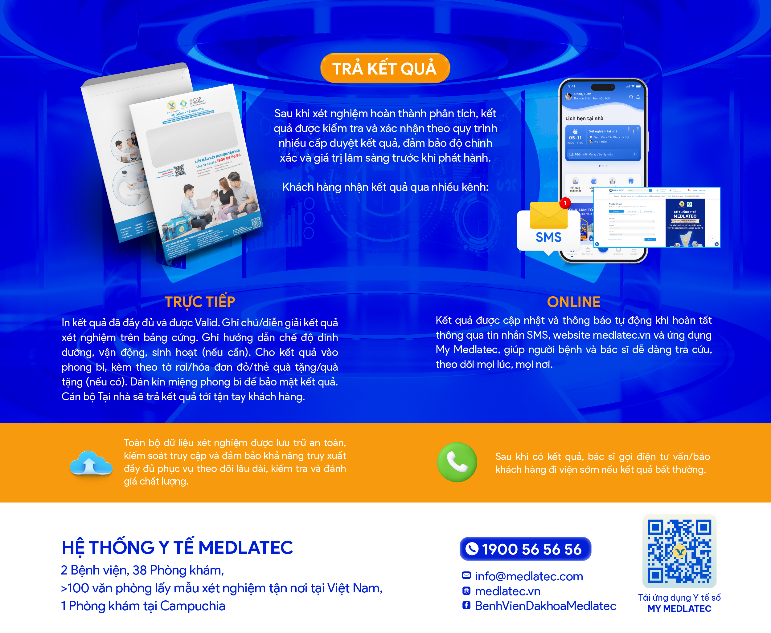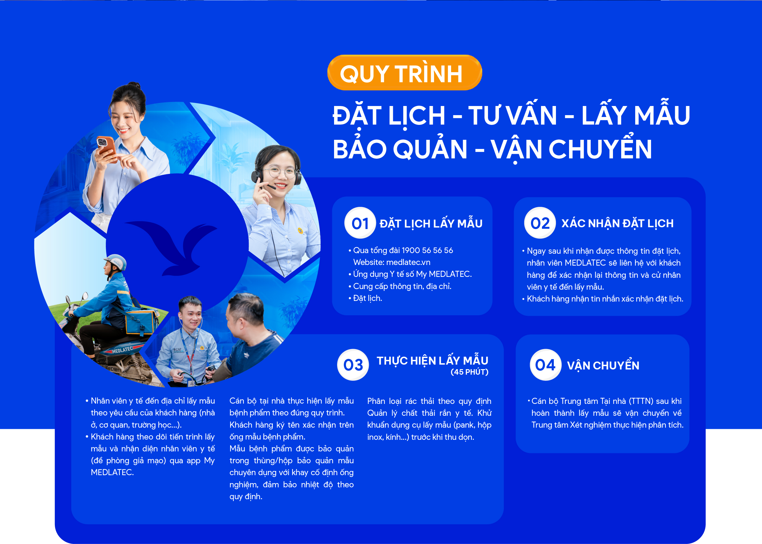 MEDLATEC không chỉ mang đến một dịch vụ tiện ích, mà còn mang đến sự tin cậy được xây dựng từ đội ngũ chuyên gia, cán bộ lấy mẫu, kỹ thuật viên giàu kinh nghiệm, chuyên nghiệp, tận tâm, cùng quy trình nghiêm ngặt và công nghệ hiện đại trong từng khâu xử lý mẫu bệnh phẩm.