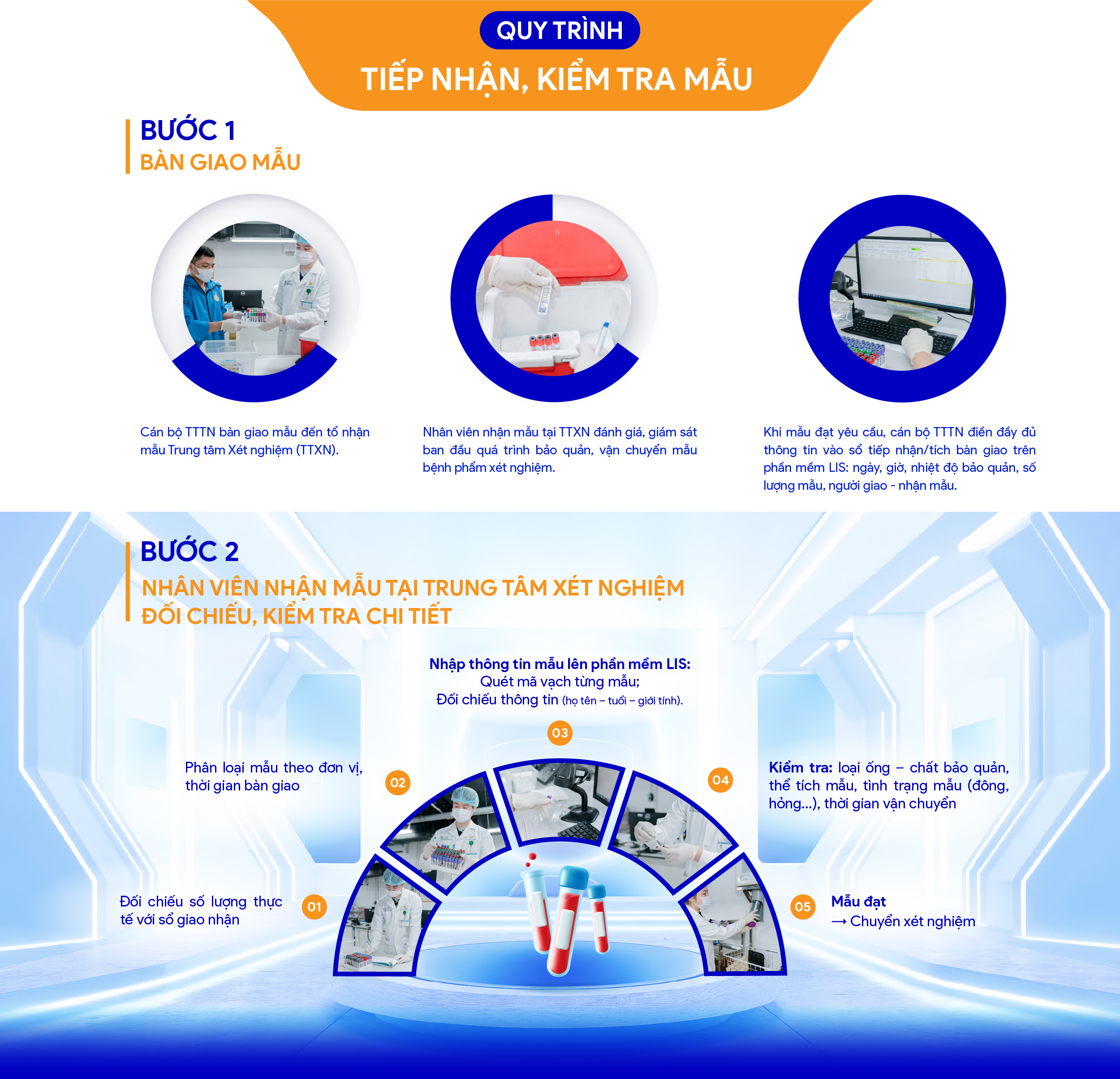 Inforgraphic dưới đây sẽ cung cấp cái nhìn chi tiết nhất về hành trình từ khi lấy mẫu, bảo quản, phân tích và trả kết quả tới tận tay khách hàng:
