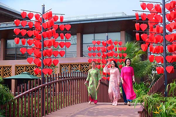Trong tà áo dài duyên dáng, các khách tham quan thong thả dạo bước trên những cây cầu cảnh quan trang trí bằng hàng trăm lồng đèn đỏ.