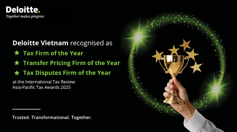 Năm 2025, Deloitte Việt Nam một lần nữa khẳng định vị thế dẫn đầu khi được Tạp chí Thuế Quốc tế (International Tax Review – ITR) vinh danh với ba giải thưởng danh giá: “Tax Firm of the Year” (năm thứ 5 liên tiếp), “Transfer Pricing Firm of the Year” và “Controversy Firm of the Year” tại thị trường Việt Nam.